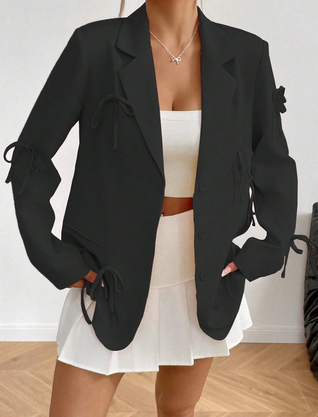 Ce blazer structuré revisite la veste classique avec une touche féminine et moderne. Ses nœuds décoratifs délicatement placés sur les manches et les poches ajoutent une note raffinée à sa coupe minimaliste. Conçu dans un tissu fluide et légèrement satiné, il allie confort et élégance pour sublimer toutes les silhouettes.