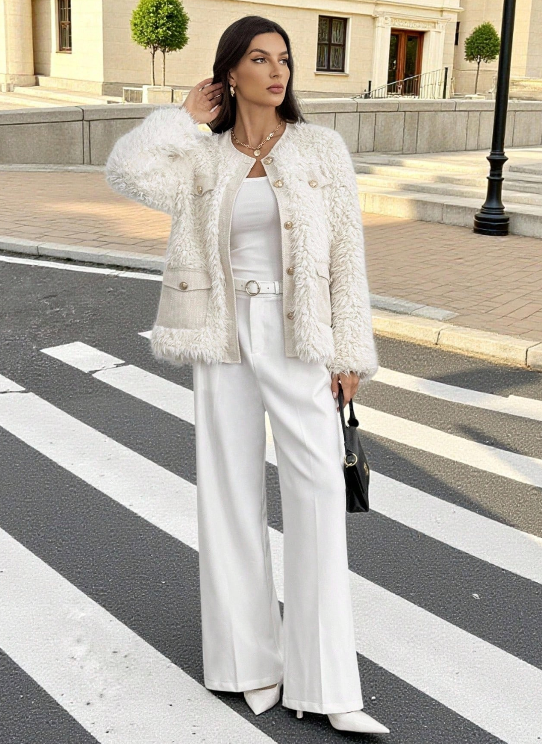 Cette veste duveteuse apporte une touche de douceur et de raffinement à vos tenues. Confectionnée dans une matière pelucheuse et structurée, elle associe confort et élégance grâce à ses détails dorés et ses poches plaquées. Sa coupe droite et légèrement ample en fait une pièce facile à porter, parfaite pour créer un look chic sans effort.