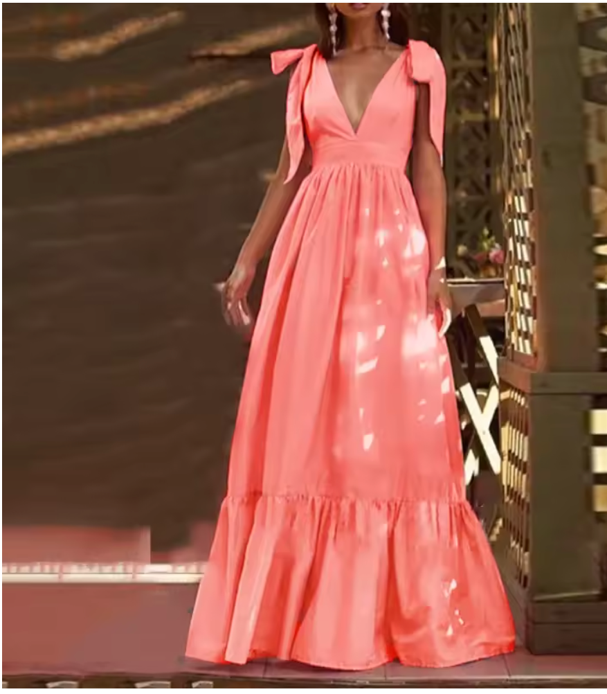 Cette robe longue ensoleillée séduit par sa coupe fluide et son décolleté plongeant ultra féminin. Les nœuds sur les épaules apportent une touche romantique et délicate, parfaite pour la saison estivale. Sa matière légère et sa taille cintrée subliment la silhouette tout en offrant un confort optimal. Une pièce éclatante qui attire tous les regards.